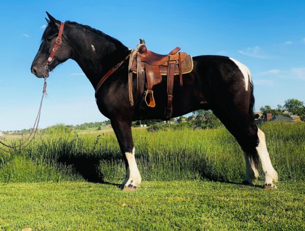 Dozer is 17HH+ hand, 6 year old, Crossbred gelding that is very stocky built and as pretty as they come! If you have been looking for that perfect draft cross gelding then look no further Dozer is the one for you. Horses like Dozer are very rare and hard to find. I’ve never owned one like him in my life. Dozer is very fancy broke and is very safe, quiet and gentle. He is the definition of Gentle Giant. He is a finished trail horse, and has done ranch work, checking fences, gathering cattle, catching cattle and knows how to handle a rope and pull like a d-9 dozer. There’s no bull that’s been able to out pull him. NOTHING phases this guy. He is seasoned on the organized and local trail rides. He has been to big parades. He has ridden in the mountains. He will ride in a group or alone.He will pony colts and mares all day long. He has also been a rodeo pick up mount. He has a JAM on stop. You put your feet forward or slightly lean forward he is stopping right then and there. Has a spin, and a great back up. Very catty on a cow left to right when asked. Will carry a flag. He is SAFE for advanced beginner and up due him being handy broke and can be rode with leg pressure. He is sure footed on trail, and HONEST. Walks through ditches, logs, through water, etc. point and go kind of ride. My favorite thing about him is how gentle and safe he is, my one year old son loves to ride him!! Don’t worry about having a hard time mounting him because he will sidepass over to the mounting block for you to mount him with the snap of your fingers. Dozer would make a great trail competition horse and has used on a obstacle course. We have ridden him many miles and has seen it all. He is suitable for all types of riders, that know the general basics of riding or anyone that wants a fun safe relaxing stress free horse to ride. He is good for the farrier and easy to bathes well as load in a trailer. He is well trained with a nice one hand neck rein with just two fingers or direct rein it doesn’t matter just depends on what’s comfortable for you, side pass , backs, rides with no bridle , has a nice turn around, nice trot and will short lope from a stand still. He honestly feels like your riding a small horse with the handle and moves that he has. You can also shoot a gun as well as crack a whip. Dozer is as close to bombproof as he can be. Take Dozer home and put him to work in any direction. The sky is the limit with him. Your favorite thing about him will be how quiet and safe he is!! Don’t miss out on this rare opportunity to own such a unique and hard to find kind of Draft Cross.