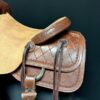 This White Rock Cutting Saddle is built on a Hadlock Brand, Buster Welch Tree, that carries a 5-year tree warranty, with Herman Oak leather, it comes standard with rawhide wrapped stirrups (pictured with Nettles stirrups – additional $125). It has a 9-inch front swell height, 13-inch width, 3-inch cantel and is a full quarter horse bar width. This saddle features a Diamond tooling pattern with roughout jockey and fenders. These saddles known as “cutters” are some of the most versatile in the industry and are used for Trails, Ranch, Team Sorting, Cutting and other disciplines as well. These trees fit a wide variety of horses from Quarter Horses to Draftcrosses to Gaited Horses. We have 16″ and 16.5″ in stock ready to ship!