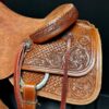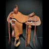 This White Rock Cutting Saddle is built on a Hadlock Brand, Buster Welch Tree, that carries a 5-year tree warranty, with Herman Oak leather, it comes standard with rawhide wrapped stirrups (pictured with Nettles stirrups $125 up-charge). It has a 9-inch front swell height, 13-inch width, 3-inch cantel and is a full quarter horse bar width. This saddle features a Basketweave/Floral combo tooling with roughout jockey and fenders. These saddles known as “ranch cutters” are some of the most versatile in the industry and are used for Trails, Ranch, Team Sorting, Cutting and other disciplines as well. These trees fit a wide variety of horses from Quarter Horses to Draftcrosses to Gaited Horses. We have 15.5″ and 16.5″ in stock ready to ship!